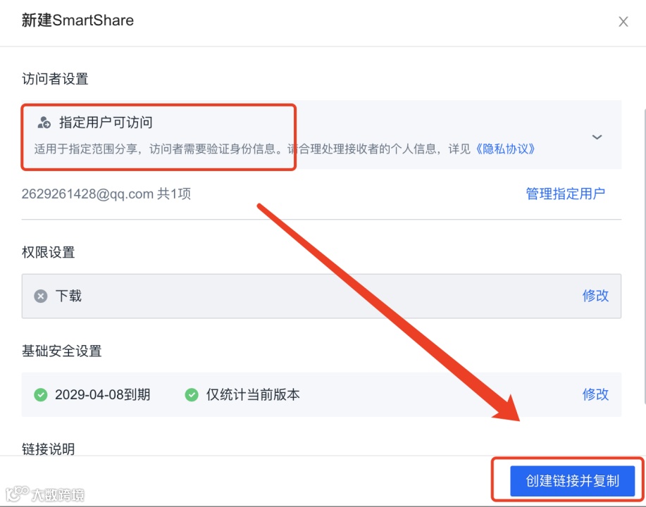 李经理在Filez选择要分享的文件,新建SmartShare链接,选择“指定用户可访问”输入招标人邮件信息并发送和通知。