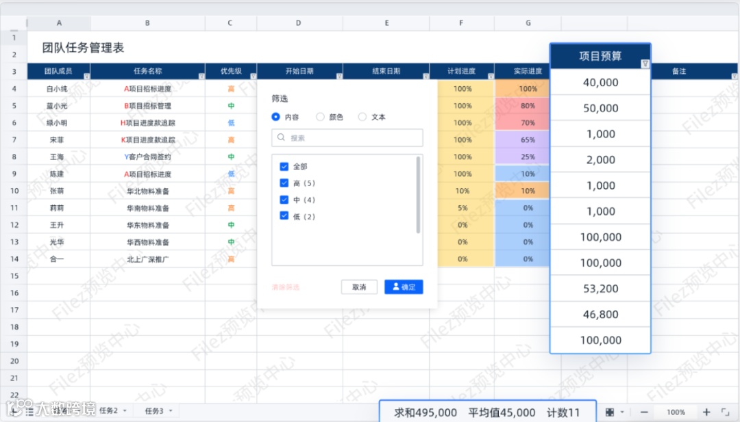 对于电子表格文档,Filez预览中心提供了查找、数据筛选、快速计算和高亮所在行列的功能。对于数据较敏感的内容,用户无需下载文档,即可在海量数据中,通过筛选快速定位到所需信息,并进行简单计算,既提高办公效率,又满足用户对电子表格预览的精细化需求。
