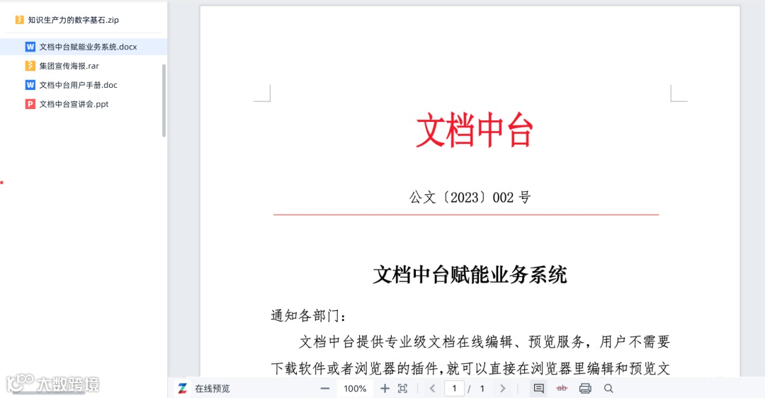 Filez文档中台-集成版支持压缩包文件预览功能,同时支持压缩包内的文档,用户无需下载即可将压缩包内的文件正常作为文件预览,摆脱了用户对本地端压缩软件的依赖。