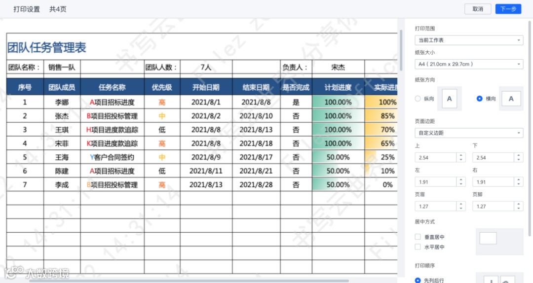 Filez文档中台-集成版新增电子表格文件的打印功能,支持当前工作表、全部工作表和选区域打印。通过在企业系统中集成电子表格打印功能,用户可以根据自身需求对相关打印参数进行设置,方便、快捷地完成电子表格的打印,提高了电子表格页面打印的准确性与美观性,更好地满足用户对电子表格打印的精细化需求。