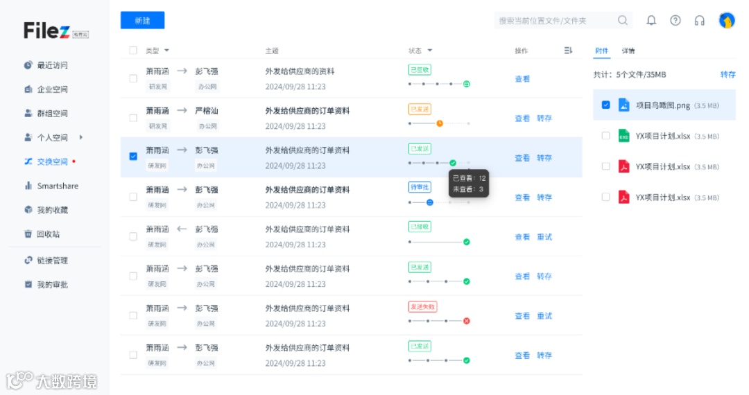 Filez全新设计的交换空间,企业上下游协作和跨国数据合规交换的首选方案,帮助企业建立数据合规、内容安全、收发可控、传输高效、精益可信的内外网和跨境安全交换通道。