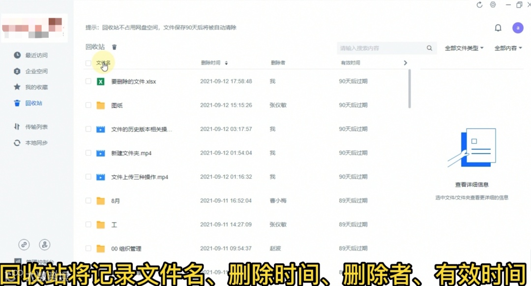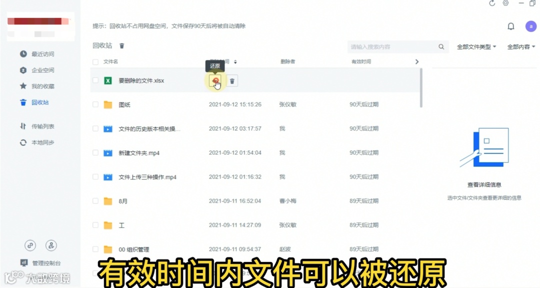 在联想Filez网盘里删除的文件一般会进入回收站中,你可以在里面找到所有被删除的文件。回收站还将记录文件名、删除时间、删除者、和有效时间,每个被删除的文件将拥有90天的有效时间,有效时间内文件可以被还原。
