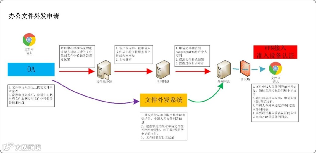 • 工作文件外发和OA流程对接,实现文件申请流程全自动外发;