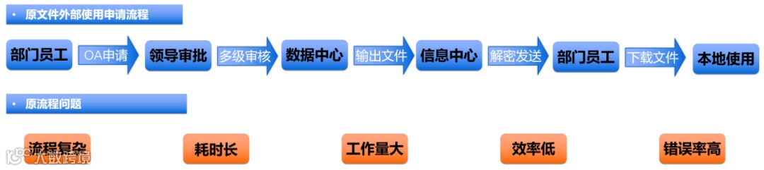 研发中心,产品部等部门员工,因工作需要把文件下载外部使用,需要走复杂的OA审批流程,申请文件解密,文件切割外发,处理过程耗费大量工作时间(40分钟左右)。最后申请人通过邮件下载到本地电脑。流程复杂而且耗时过长,严重影响工作效率。