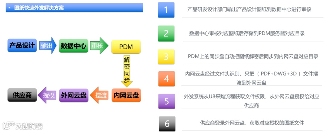 合作供应商需要获取图纸(PDF+DWG+3D)进行配件加工评估和报价,原来是设计部门设计好的图纸给到数据中心,数据中心审核后到采购部门,采购部门走U8流程后,把图纸线下邮件给到供应商,发送之前需要申请信息部门解密,文件大就需要切割发多个邮件,供应商获取图纸后进行加工评估和报价,整个图纸外发流程走线下,既不能保证设计图纸安全,效率也低下。