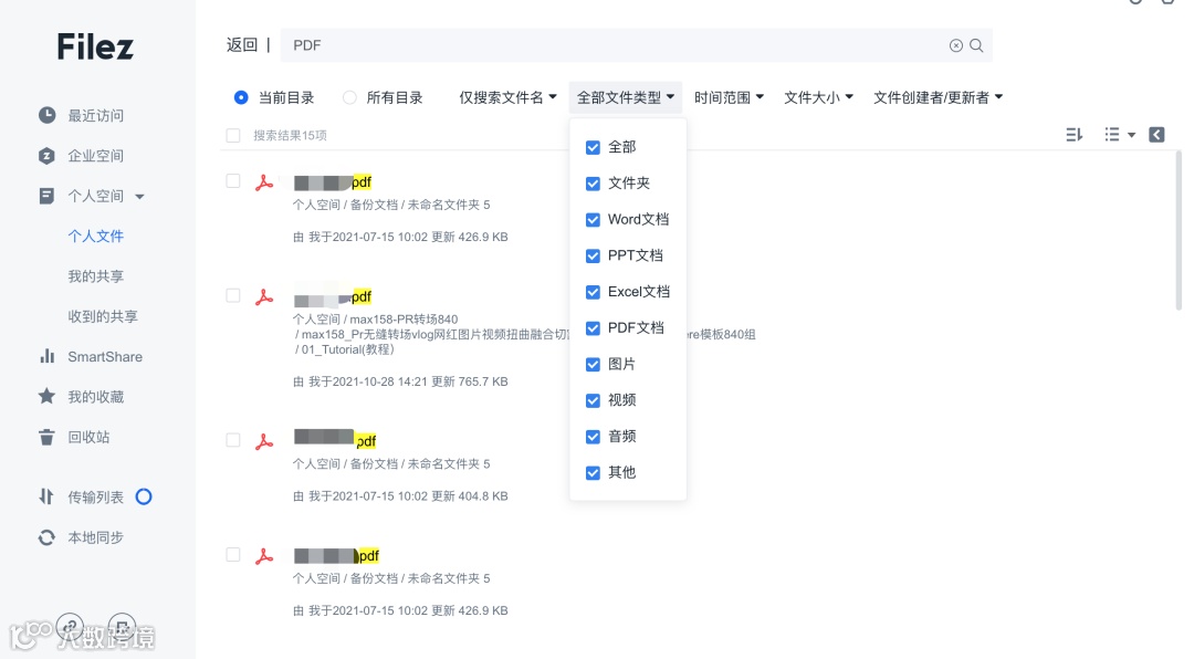 筛选时,可以选择搜索的目录范围;关键词搜索也可以选择搜索文件名、全文搜索和备注标签搜索三种方式;文件类型可以直接选择勾选,使文件检索更加精准;还可以选择时间范围和文件大小,如果知道文件创建者和更新者,还可以直接输入来进行搜索,让文件搜索简单又快捷。