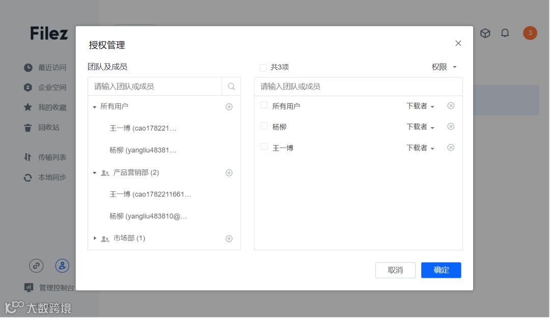 蓝色文件夹可以设置所属层级、团队名称、团队人数、数据中心、团队文件夹等内容。这样一个多部门的公司的文件内容可以分别上传到所属层级的蓝色文件夹内,真正做到高效协作办公,管理公司成员。