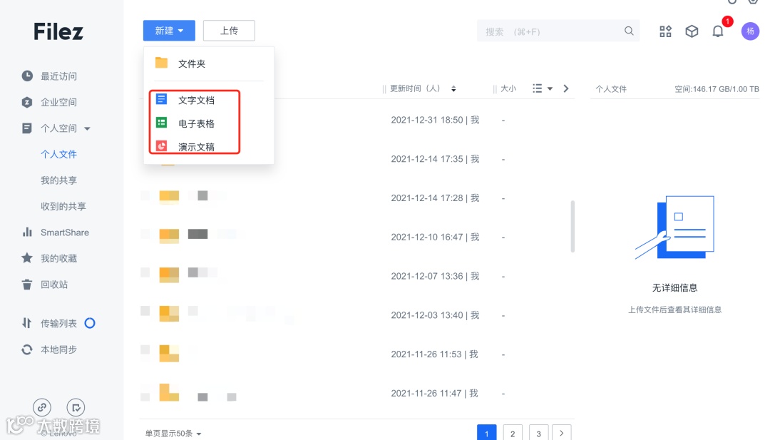 Filez企业网盘中有两种不同的文件夹,一种是黄色文件夹(普通文件夹),一种是蓝色文件夹(创建团队自动生成团队文件夹)。