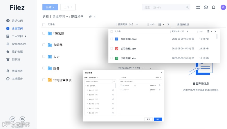 联想Filez轻量级知识智库,无需专人专岗进行归档梳理,无需繁杂的文档使用制度,让文件和知识得到统一管理,公司海量文件资料安全存储,并且不同的部门不同职位赋予不同的权限,HR如果需要不同部门的资料可以获得该部门预览权限后查看内容资料,同时兼容office格式,无需下载即可在线预览文件,同时可以提高协作效率和知识学习赋能效果,打造企业需要的知识体系。