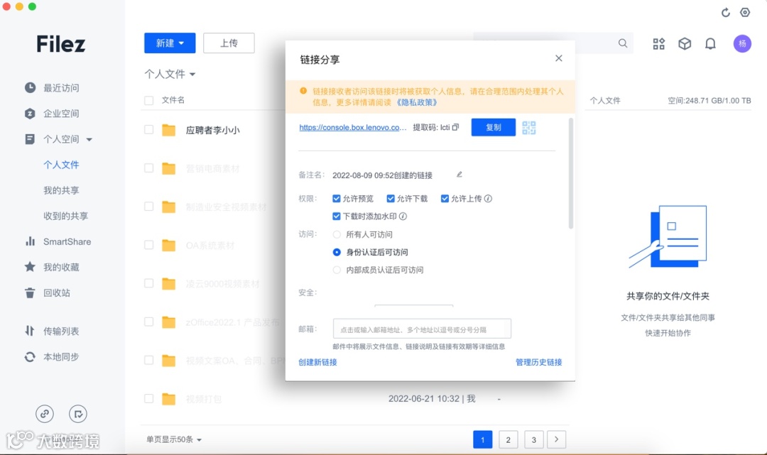 当企业需要搜集应聘者材料时,通过邮件打开大文件时间花费久,应聘者上传也会有负担,但是通过Filez企业网盘就可以解决这一问题,HR可以在企业网盘中设置一个命名为A候选人的链接,发给应聘者,应聘者把所需材料上传到链接就可以了,HR也可以实时同步打开链接里的文件。同时,Filez提供PB级存储空间,HR可以便捷整理归档入职者的各种材料。