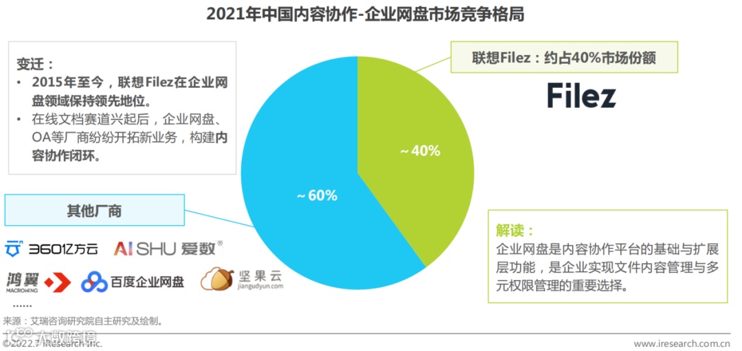 在调研了大量市场需求和内容协作平台的市场竞争情况后,报告指出:“目前大部分厂商仍定位于基础层,注重满足企业文件管理与存储的需求,仅有少数头部厂商已进入创新阶段,这些头部厂商中联想Filez居市场第一, 约占40%市场份额。”