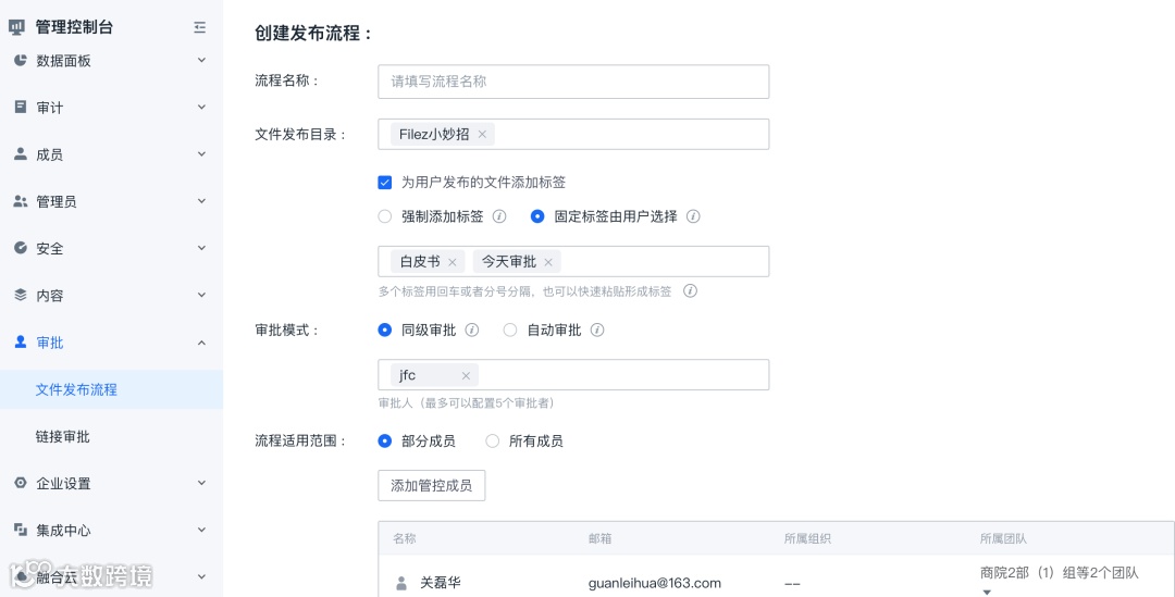 发布审批流程名称,设置文件发布目录并给文件打上标签,便于审批者查看。可以设置同级审批和自动审批,以及流程适用范围。