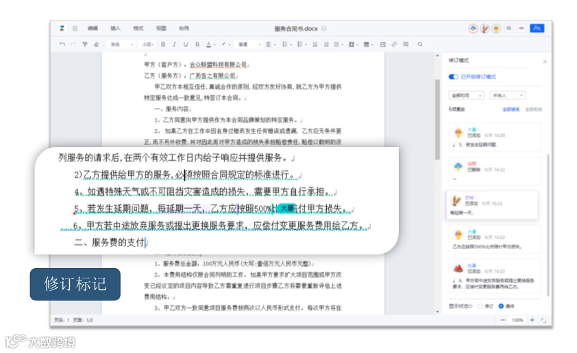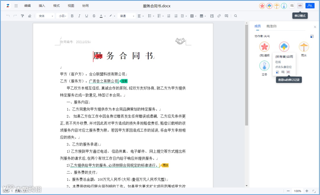 通过zOffice的在线协同编辑,不同角色协作编辑合同内容,省去手动合稿,版本比对需要的大量时间。