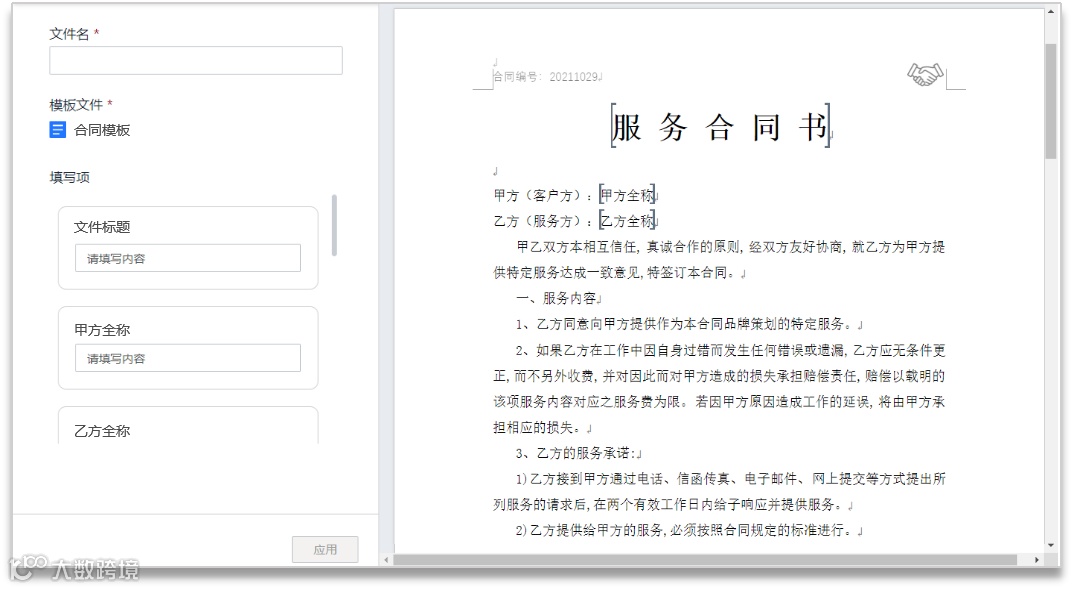 选择合同模板后会根据书签自动生成表单,关键信息快速写入,并自动生成完整格式的合同文档。