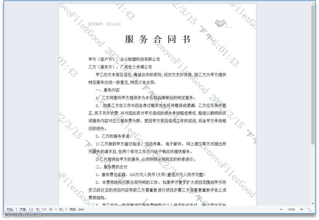 在线预览合同时,自动添加动态水印效果,其中水印是通过用户名和时间合成,防截屏防拷贝,保证合同内容不泄露。