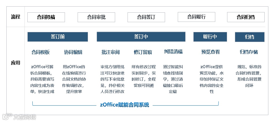 zOffice提供文档的编辑和预览能力,合同管理系统可以将zOffice能力集成进合同管理流程中,实现合同模板管理、合同自动拟制、在线预览、协同编辑及在线审阅会签,形成完整的合同管理体验。在协作的同时更好的满足企业对信息管控的要求,在保证工作流程稳定安全的基础上,提升合同管理效率。