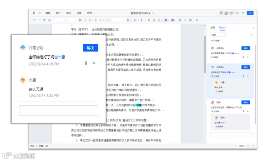 批注实时讨论,提出审阅意见,并@相关成员对问题进行关注,修改对话一目了然,批注过多时可以按照成员或者关键字进行查找。