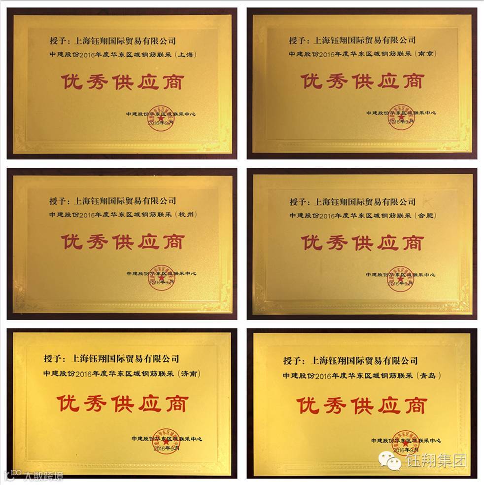 9月21日,中建股份在江苏南京举行2016年度华东区域钢筋联合集中采购供需对接会,主要对华东地区安徽、江苏、上海、浙江四省市重点地区的优秀供应商进行表彰,对四省市2016年重点工程项目进行推介对接。集团下属上海钰翔国际贸易有限公司等多家子公司在上海、南京、杭州、合肥等地共荣获4项优秀供应商称号,此外,本月上旬,上海钰翔国际贸易有限公司荣获中建股份华东区域联采中心济南和青岛两个地区优秀供应商荣誉称号,至此,集团在中建联采华东区域五省市共获得6项优秀供应商殊荣,是中建联采系统华东区域受表彰最多的优秀供应商。