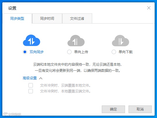 单向上传:您选择的本地文件将被上传更新到云端,本地文件的删除操作将不会删除云端文件;