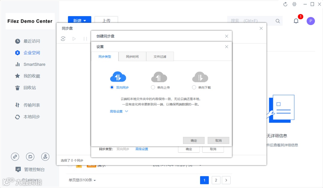 打开联想Filez网盘,在本地同步功能中有两种同步方式:同步本地文件夹和同步云端文件夹。首先选择需要同步的文档和将同步云端的位置,在高级设置中,可以选择同步类型,同步时间和文件过滤。