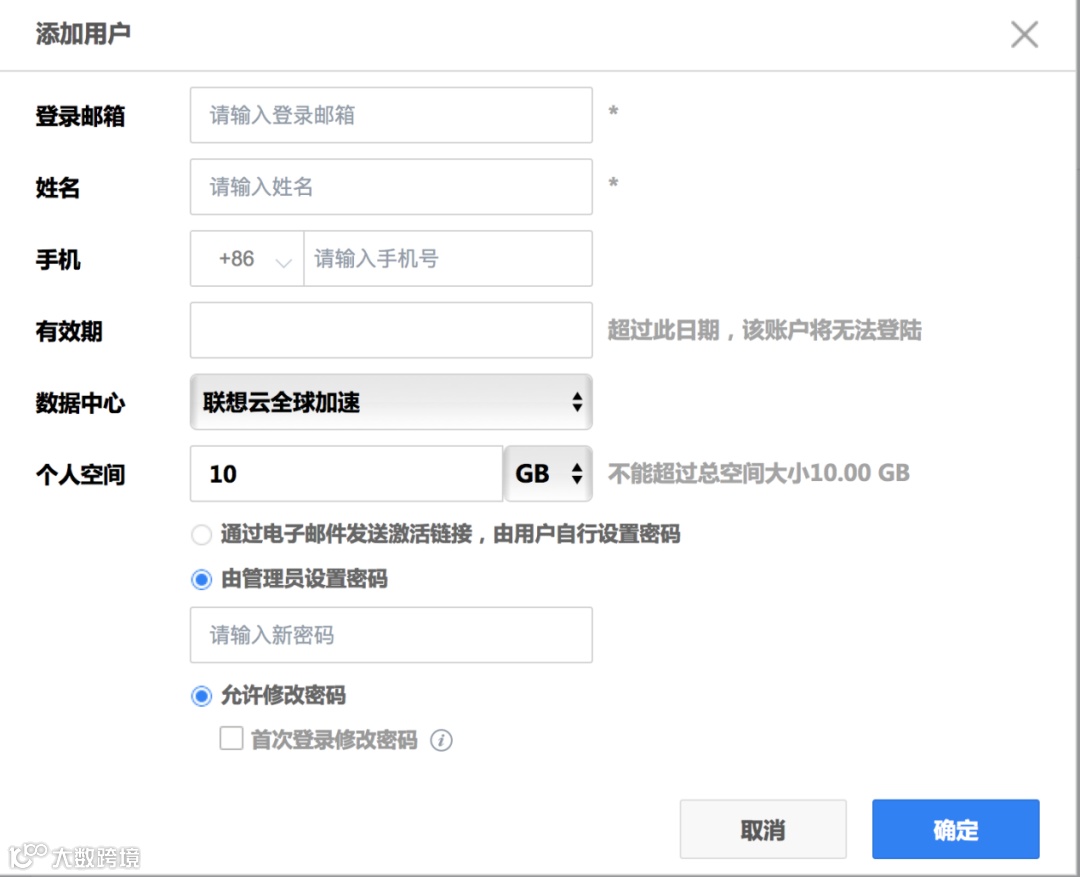 (2)添加团队成员:可以创建新用户、添加现有用户和导出用户。添加现有用户需要登记输入用户信息,设置个人空间大小以及密码等等,也可以从现有部门分类中导出。