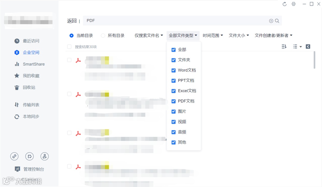 文件类型可以直接选择勾选,使文件检索更加精准。支持10余种搜索条件灵活组合,通过大小、更新时间、创建者、类型几个维度,缩小检索范围,快速定位文件。