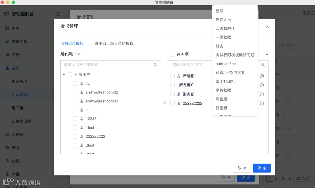 不同的身份对文件有不同的权限,团队管理员对团队成员进行文件夹的授权后,成员才可以拥有相应的执行操作,没有对其授权的文件夹是看不到的。
