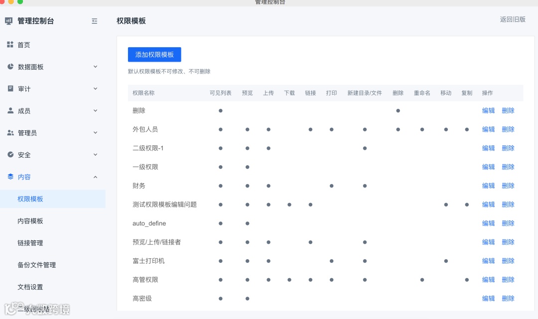 联想Filez拥有多种权限模板,可见列表,无链接编辑者,无删除编辑者,还有禁止访问都是网盘独有的权限模板。