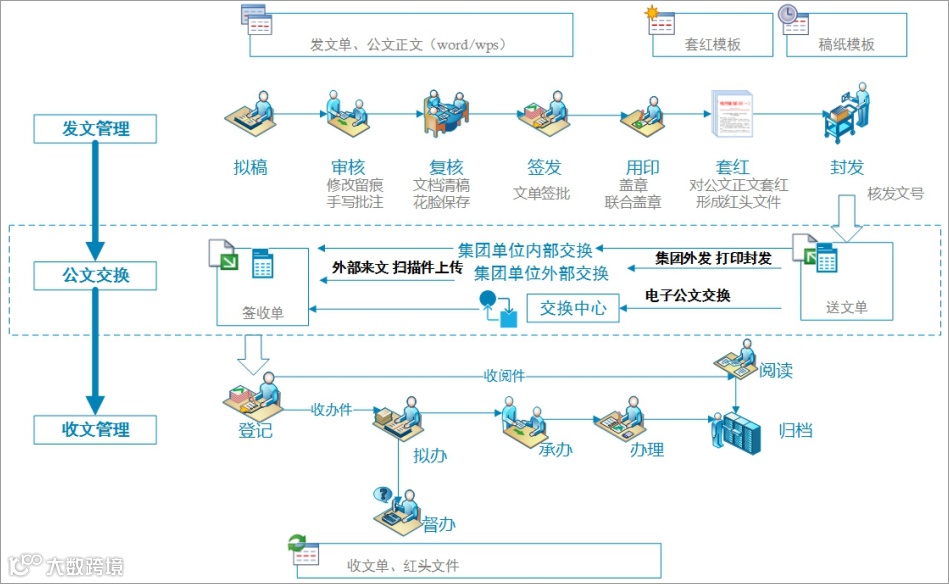 在线文档集成到OA办公系统,支持公文在线编辑、套红,提供更好的公文拟稿、审批和流转的无缝集成体验、支持导出为ofd、pdf格式文件、预览者、编辑者水印,提升工作效率的同时,完美的原格式还原,极大的提升了公文流转效率。