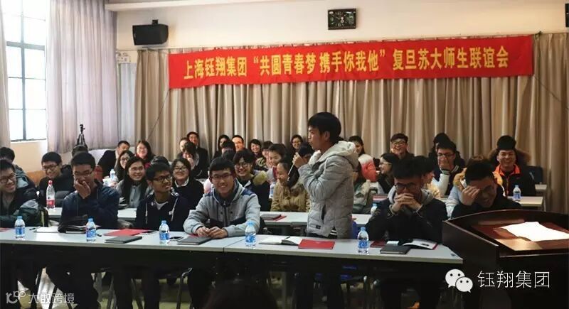 当天上午,两校师生一早就来到了活动举办地。上午10点,联谊活动正式开始。金承经理首先介绍了出席联谊会的集团领导和两校老师,随后复旦和苏大两校学生进行自我介绍。接着,葛卫国董事向各位老师和同学介绍了集团三十年的艰苦创业历程和企业文化,并和大家一起观看了集团形象宣传片,使各位老师和同学对集团有了初步了解。接着,两校老师及学生代表分别发言,他们都对集团的慷慨资助表达了感谢,对集团三十年的壮丽历程表达了钦佩,同时也对所有学生提出了要求,要求大家懂得感恩,努力学习,回报钰翔、父母和社会。