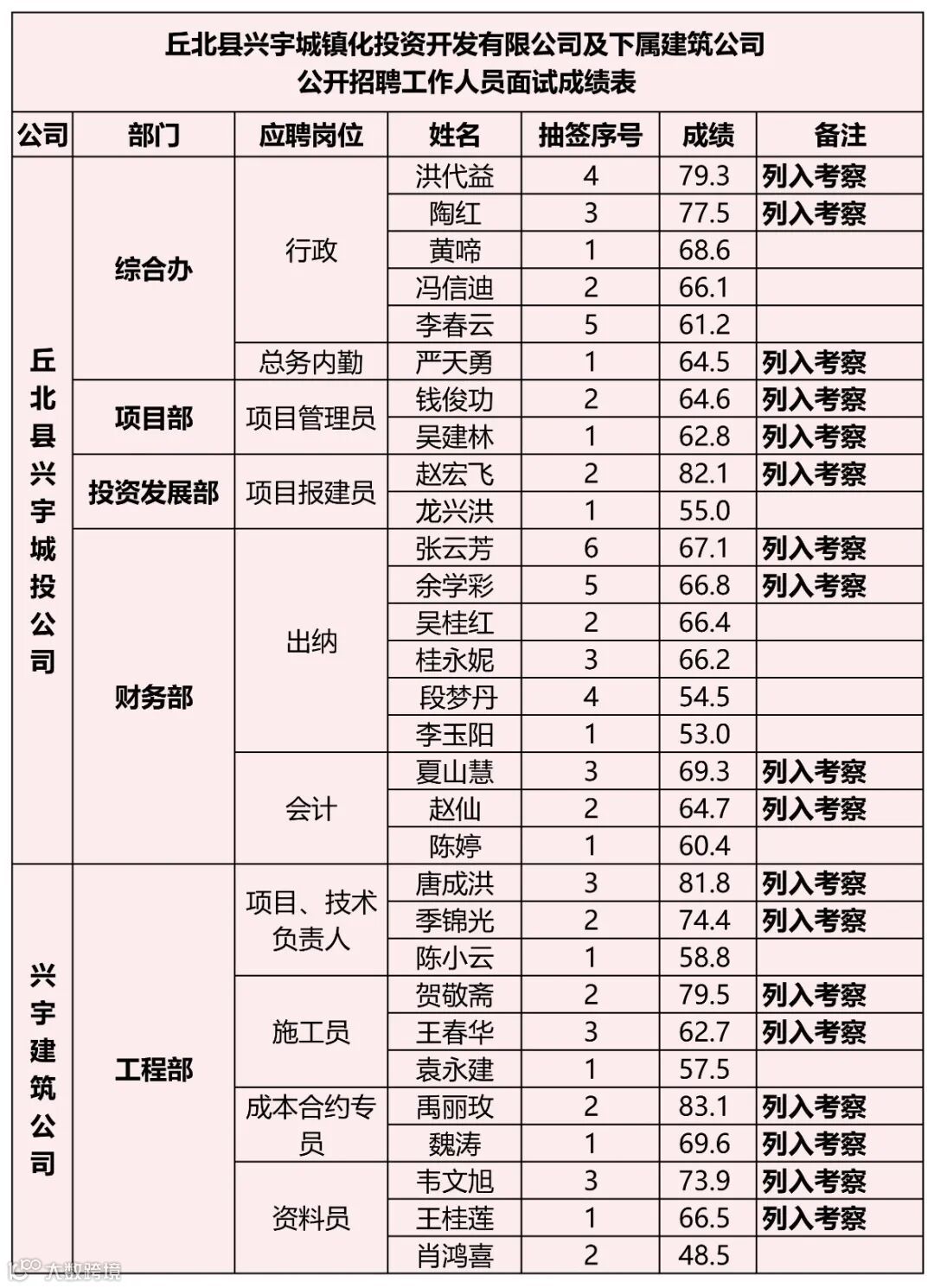 我公司根据《丘北县兴宇城镇化投资开发有限公司招聘公告》的要求,现将2023年11月20日参加面试人员的成绩、岗位综合排名予以公示(详见附件),并就相关事项通知如下: