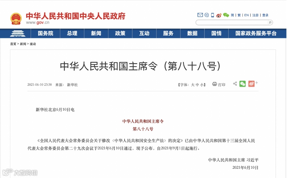 2021年6月10日,中华人民共和国第十三届全国人民代表大会常务委员会第二十九次会议通过了《全国人民代表大会常务委员会关于修改<中华人民共和国安全生产法>的决定》,并予以公布,自2021年9月1日起施行。