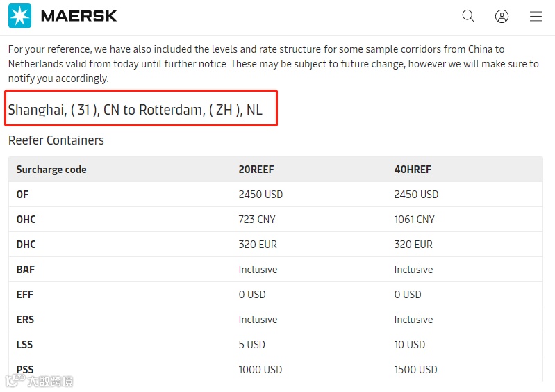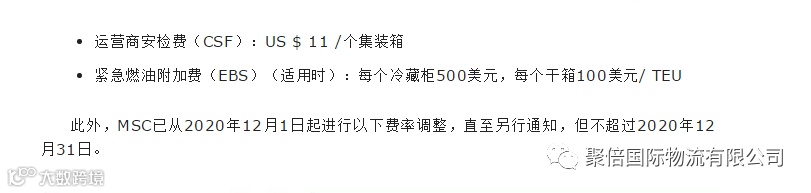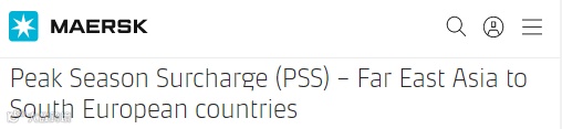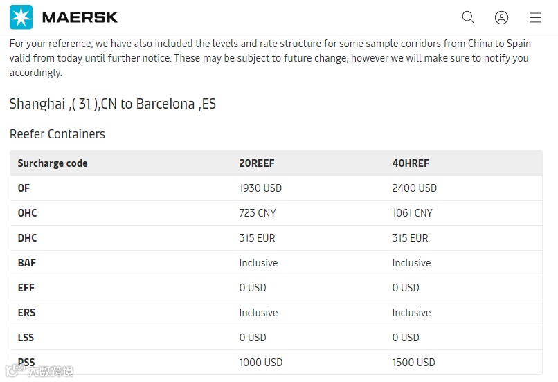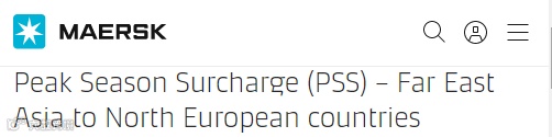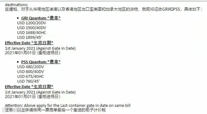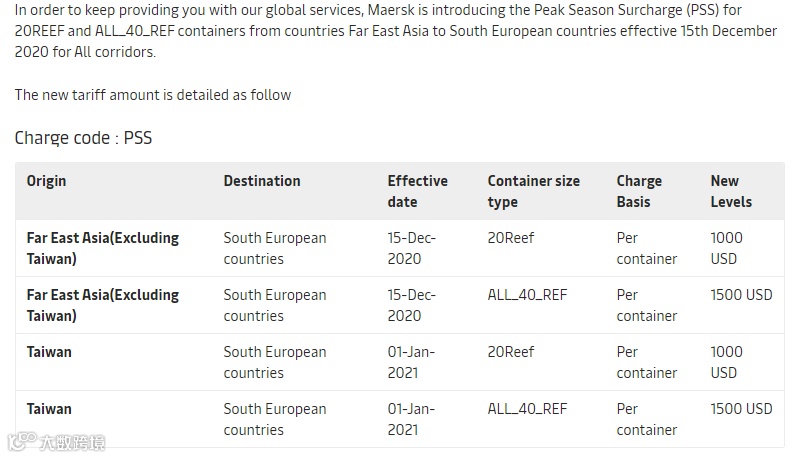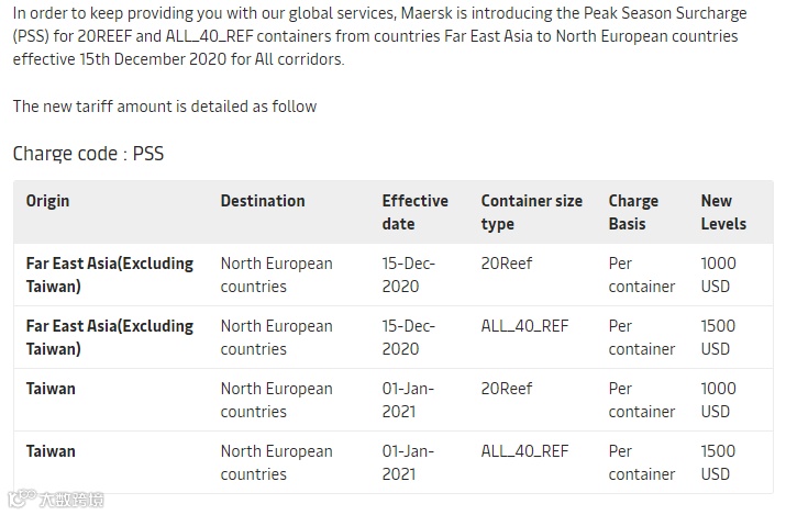 最大的航运公司马士基宣布已于12月至明年在欧洲和东亚地区征收一项新的旺季附加费(PSS)。适用于从远东到北欧和南欧国家的冷藏货物。附加费将为$1000/ 20'冷藏箱,$1500/40'冷藏箱,并将于12月15日生效,台湾PSS将于2021年1月1日生效。