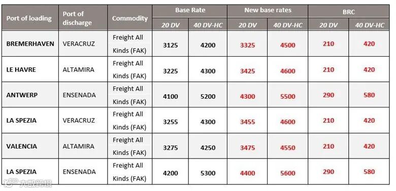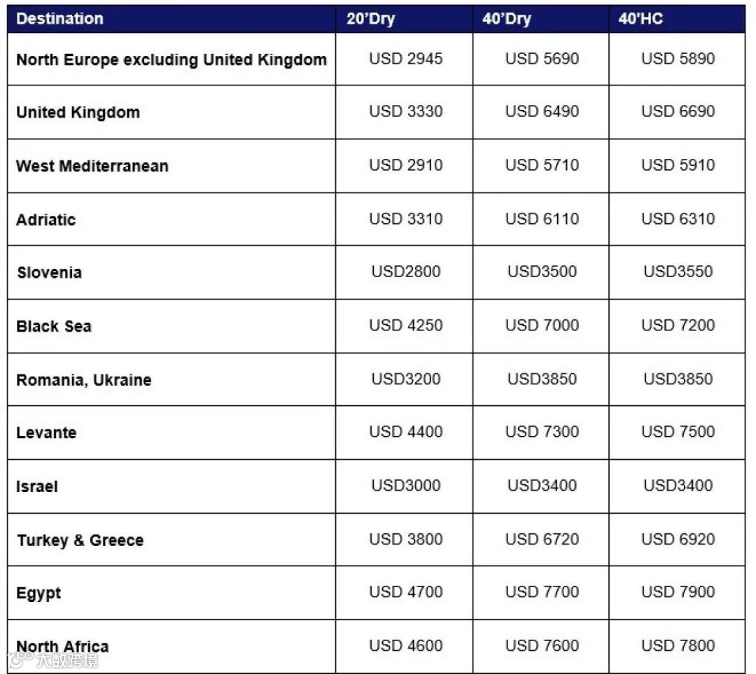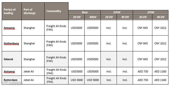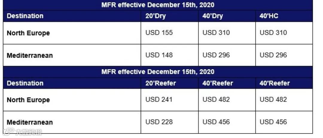 从1月1日起,这家位于马赛的承运人还将对干箱,冷藏箱,敞开式集装箱,平板架和托运人拥有的集装箱(SOC)实施以下FAK费率。