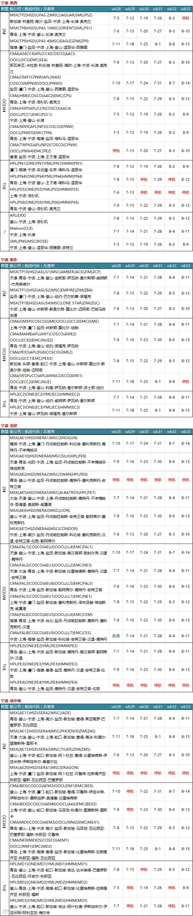 挂靠宁波舟山港的航线中,共停航34条,并出现一次跳港。北欧航线与地中海航线停航次数最多,分别为12与13条。