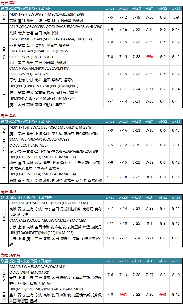 挂靠高雄港的航线中,共停航3条,其中美西航线停航1条,地中海航线停航2条。