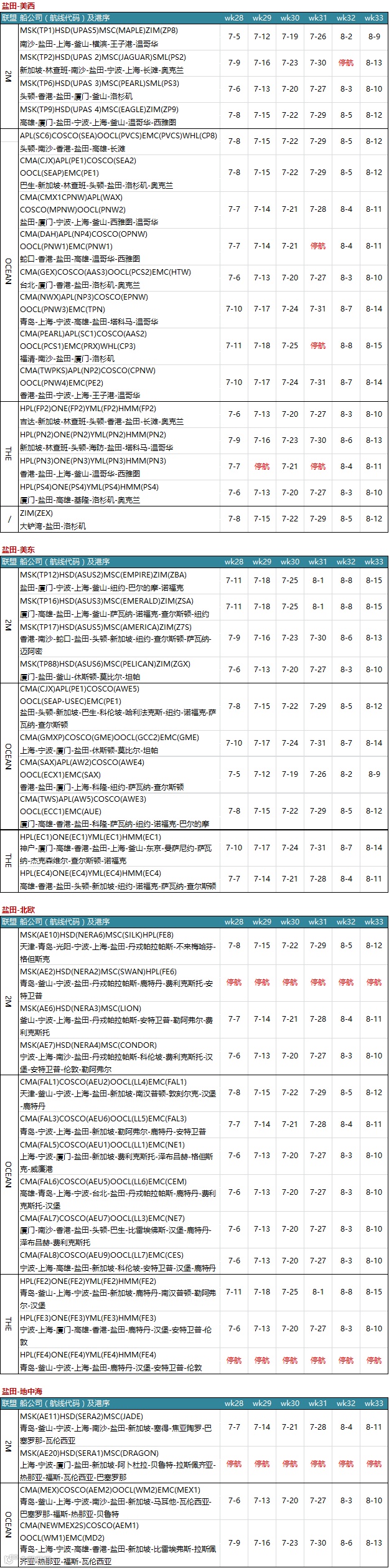 日前,容易船期发布2020年第28周至第33周中国出发到北美/北欧/地中海港口船期表。第28周至第33周共计停航133个航次,宁波舟山港停航数量最多,达34条;上海港其次,为31条。北方港口中,青岛港停航最多,达18条;南方港口中,盐田港停航23条,香港港停航4条,厦门港停航8条。