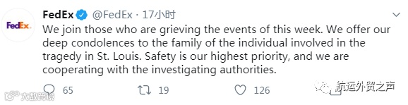 随后,联邦快递在一份声明中表示,“我们非常悲痛地获悉一起悲剧,其中涉及圣路易斯市的一名示威者和我们的一辆货车。我们向遇难者家属致以最诚挚的慰问。对于联邦快递来说,没有比安全更重要的事情,我们目前正全力配合有关部门调查。”