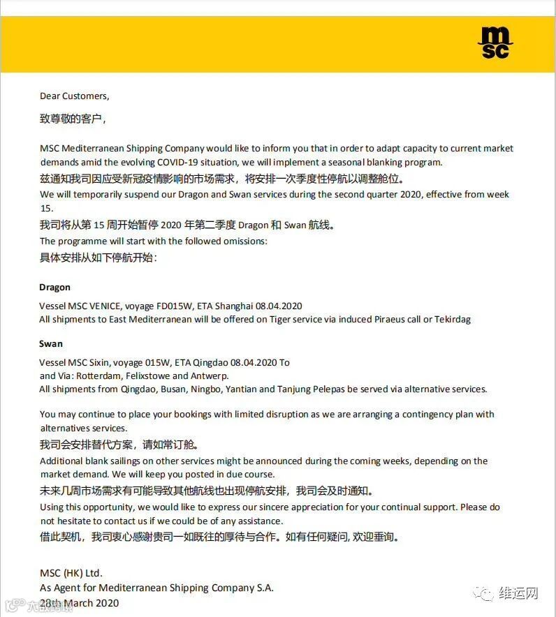 集装箱海运货量预计将在5月左右出现大幅下滑,一场集运公司之间的价格战即将打响。已有船公司发布通知:提醒客户,因受新冠疫情影响,将安排一次季度性停航以调整舱位。