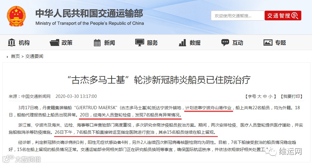交通运输部发布了“古杰多马士基轮涉新冠肺炎”的情况说明: