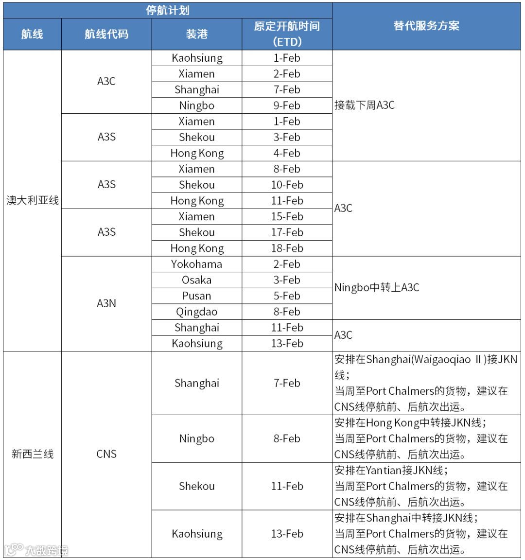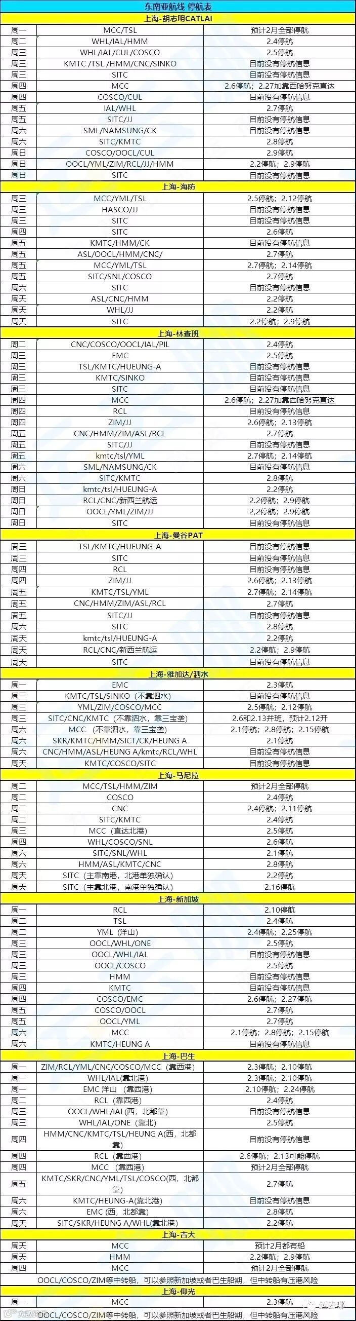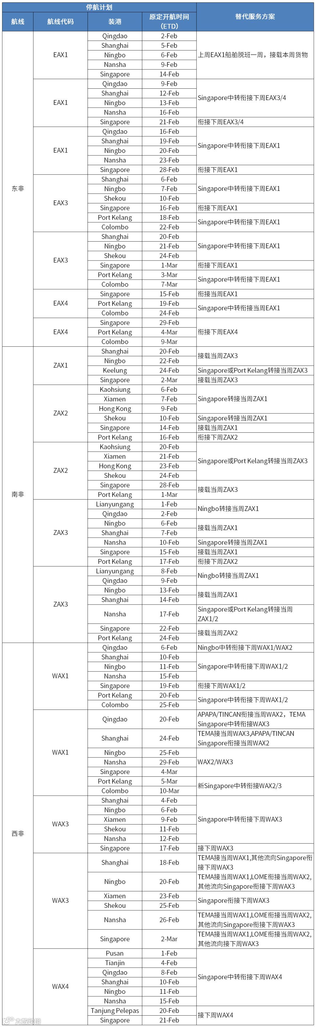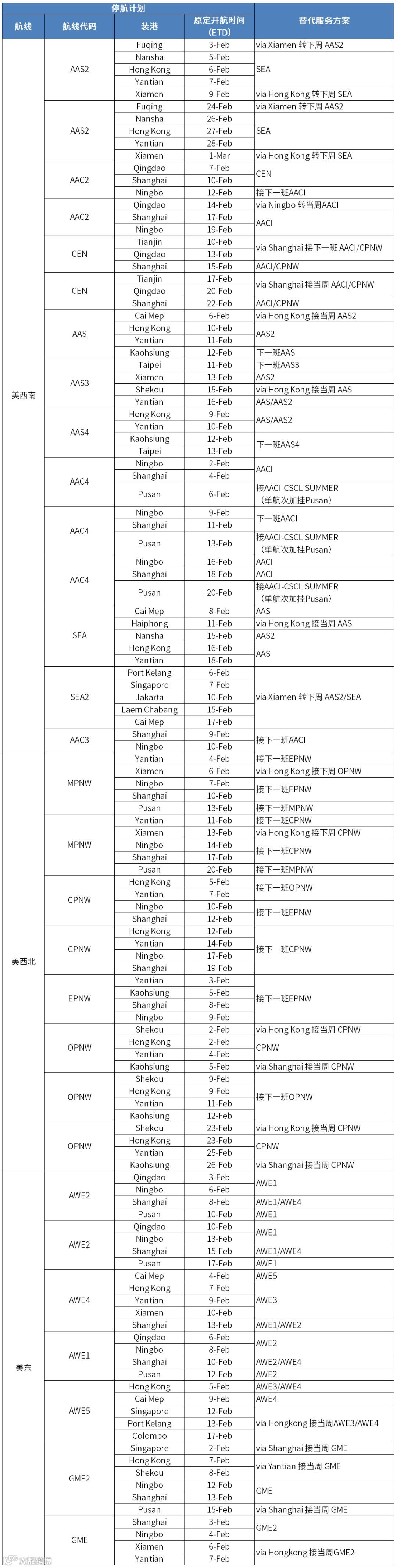 受春节以及其他原因影响,各大船公司发布最新停航通知,整理如下: