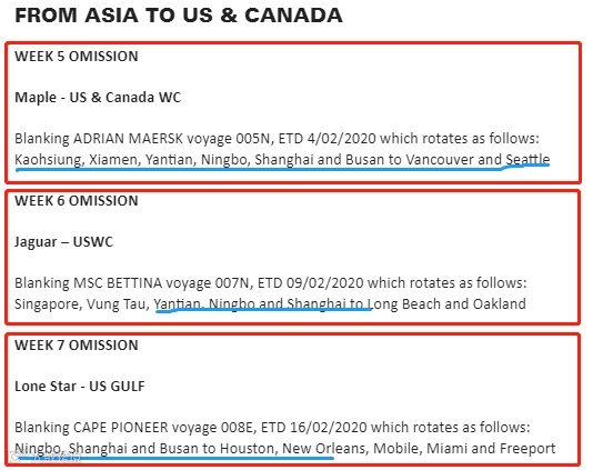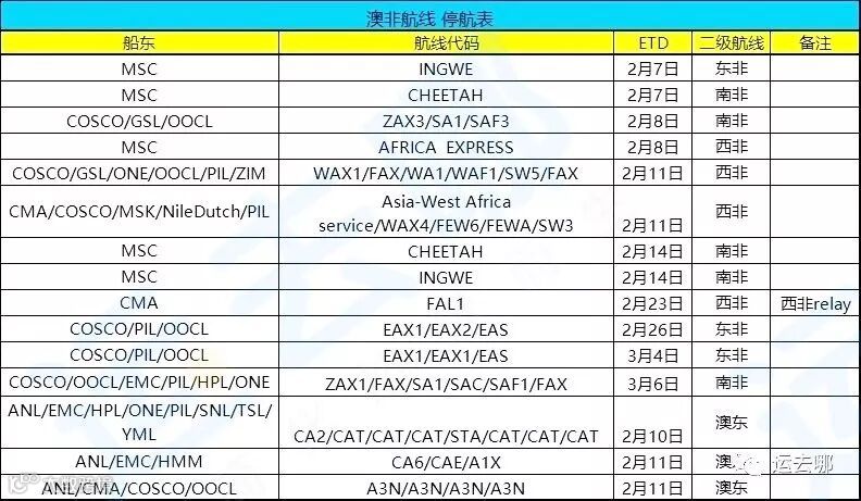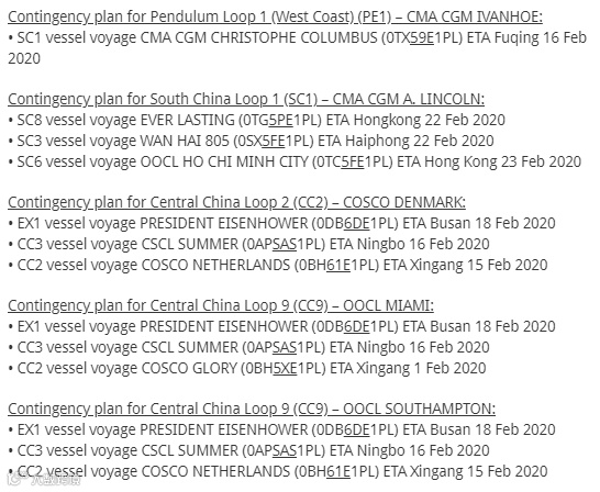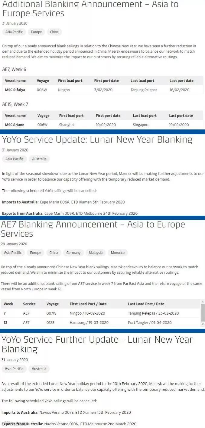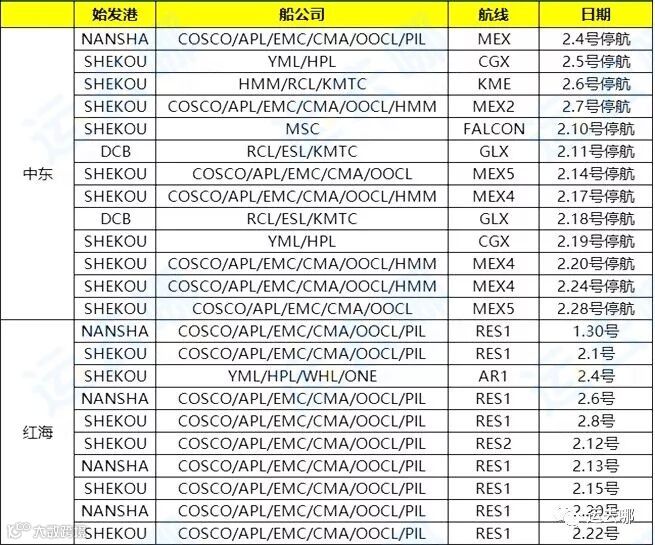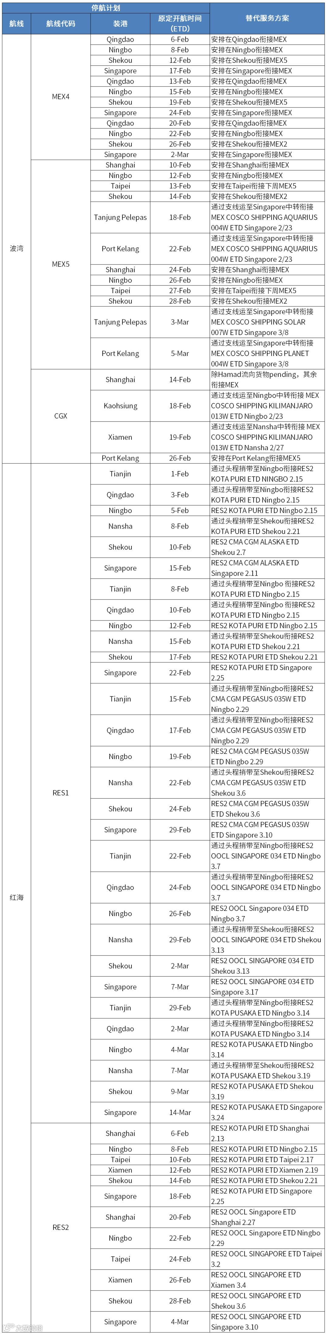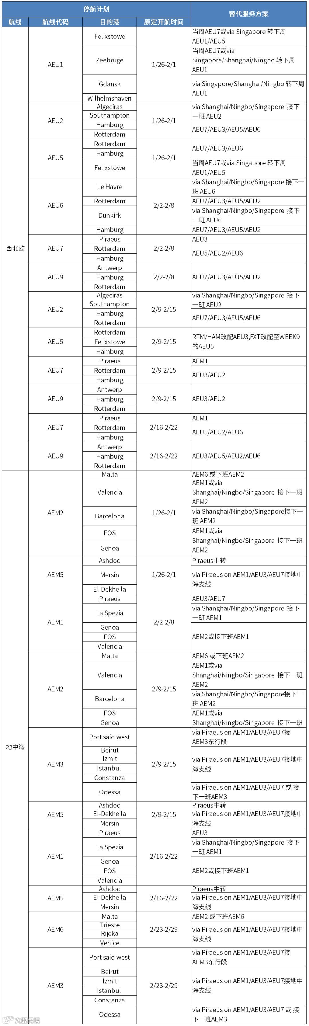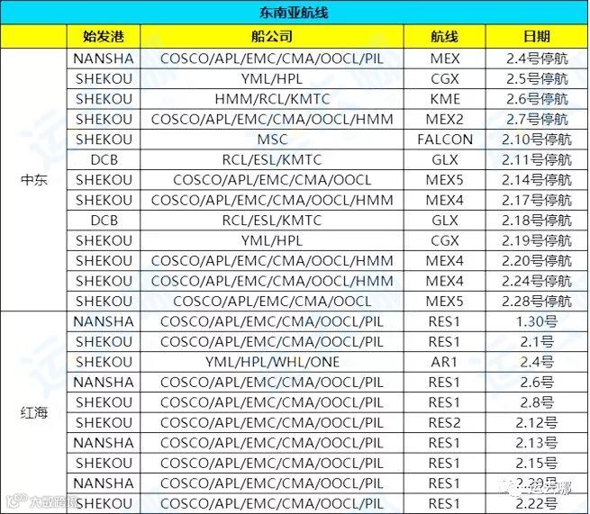 受春节以及其他原因影响,各大船公司发布最新停航通知,整理如下: