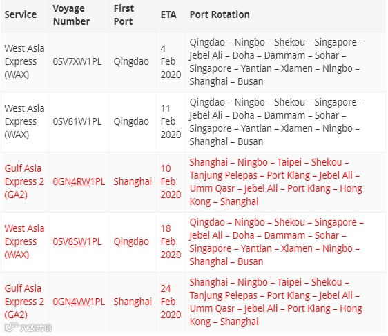 为了确保供需平衡,APL将于2月份宣布在其亚洲-中东航线上增加以下void sailings。红色为新增的,黑色的先前已经宣布为blank sailings: