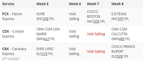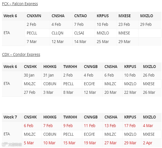 APL宣布在农历新年期间在其Condor Express(CDX)和Caracara Express(CRX)航线服务上停航(红色):
