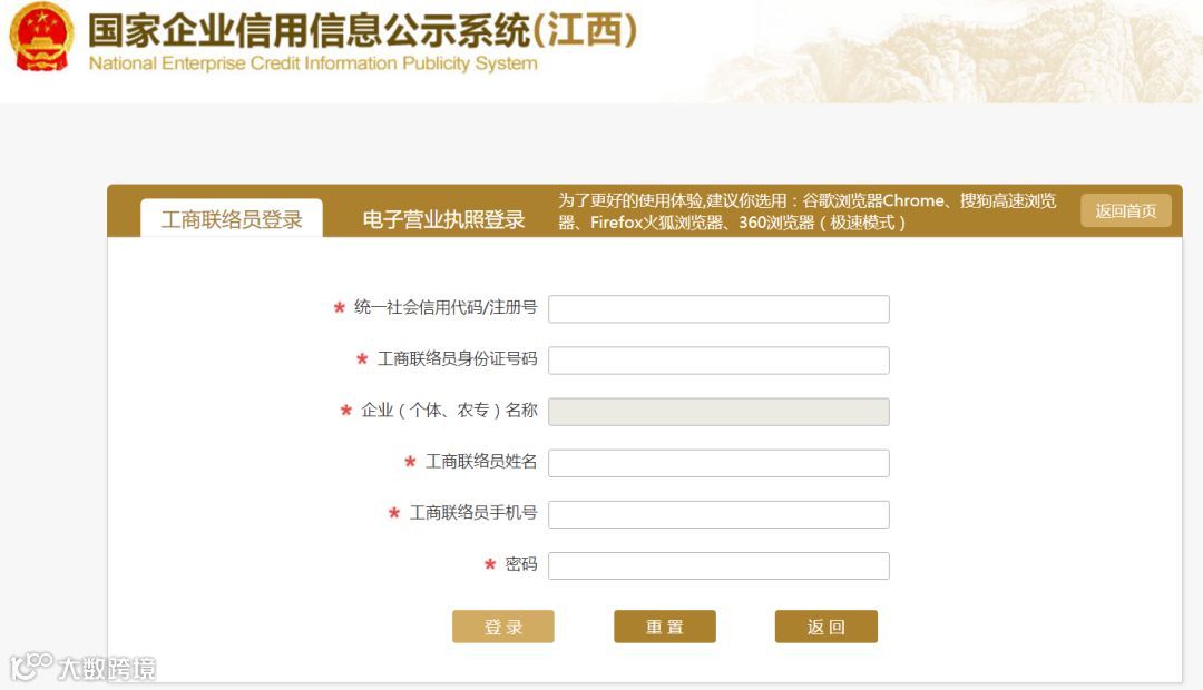 首先请输入网址http://www.gsxt.gov.cn进入国家企业信用信息公示系统首页。建议使用谷歌浏览器Chrome、搜狗高速浏览器、Firefox火狐浏览器、360浏览器(极速模式)登陆。