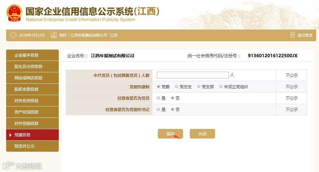 党建信息为不公示信息,主要采集企业党组织的建立情况,但属于抽查范围,请注意如实填写。其中,中共党员(包括预备党员)人数,为截至年度报告年份12月31日的人数。