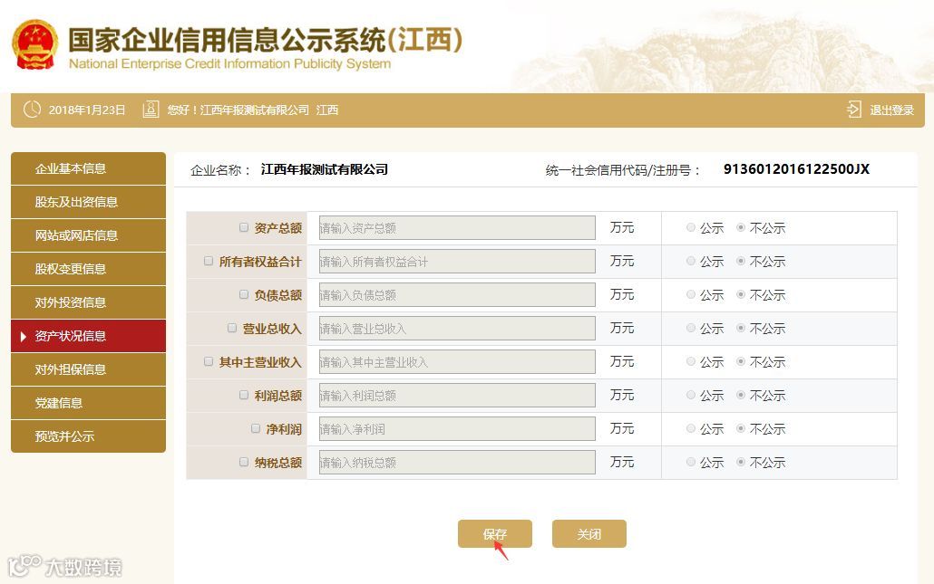 点击左边“资产状况信息”填写后保存。企业资产状况信息,应当是企业年度资产负债表和损益表(利润表)中的期末数;纳税总额为企业全年实缴各类税金的总和。