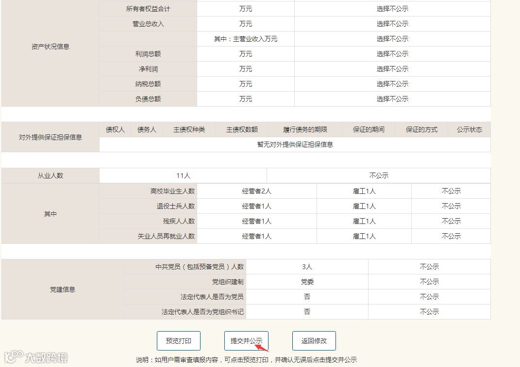 这是公示的最后一步,点击左边的“预览并公示”,检查所填写的所有信息,如果没有问题点击“提交并公示”,出现“提交成功”,点击确认。年报就完成了。