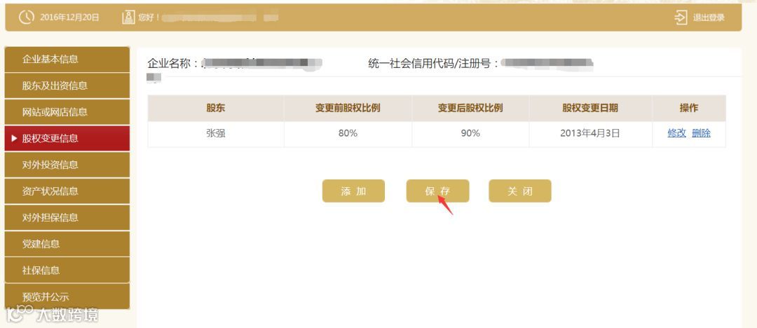 请点击左边的“股权变更信息”,之后再点击“保存”。