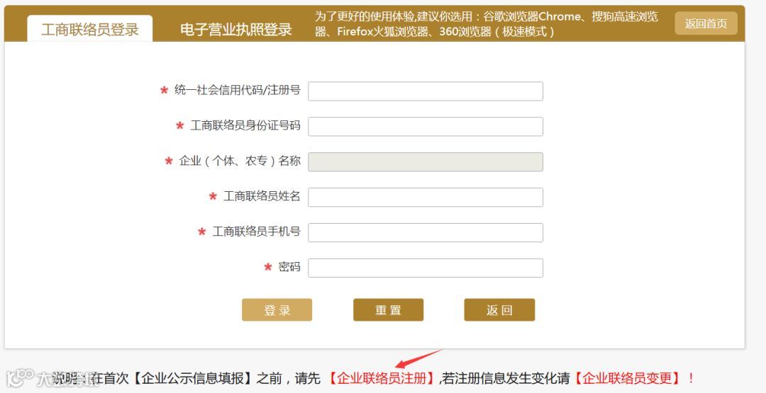 在“统一社会信用代码/注册号”栏内填写社会统一信用代码,企业名称会自动弹出,在“工商联络员身份证号码”栏内输入联络员身份证号码,工商联络员姓名及手机号码会自动弹出,再输入密码,点击登录。如果是初次参加年报,在该步操作前先点这个界面下方的“企业联络员注册”,注册联络员信息后再操作第二步。